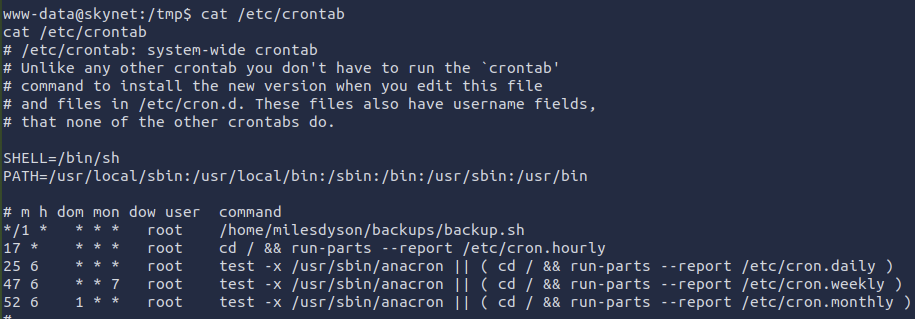 A job is running each minute and execute a script located at /home/milesdyson/backups/backup.sh. This script only compress (with tar) the content of /var/www/html with a wildcard using sudo rights.