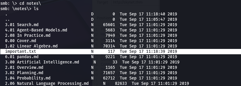 gobuster dir -u http://skynet.thm/45kra24zxs28v3yd/ -w /usr/share/wordlists/SecLists/Discovery/Web-Content/big.txt
