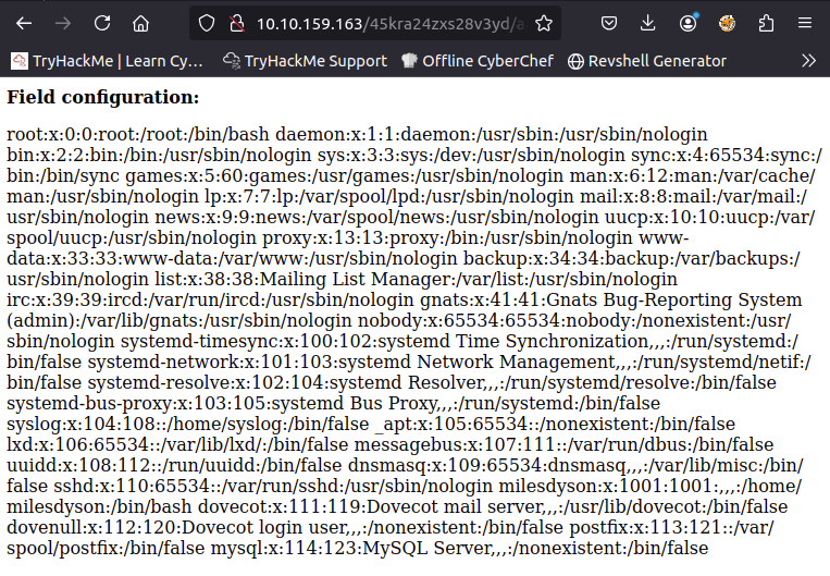 /config | 301 | http://skynet.thm/config/ | Resource forbidden |